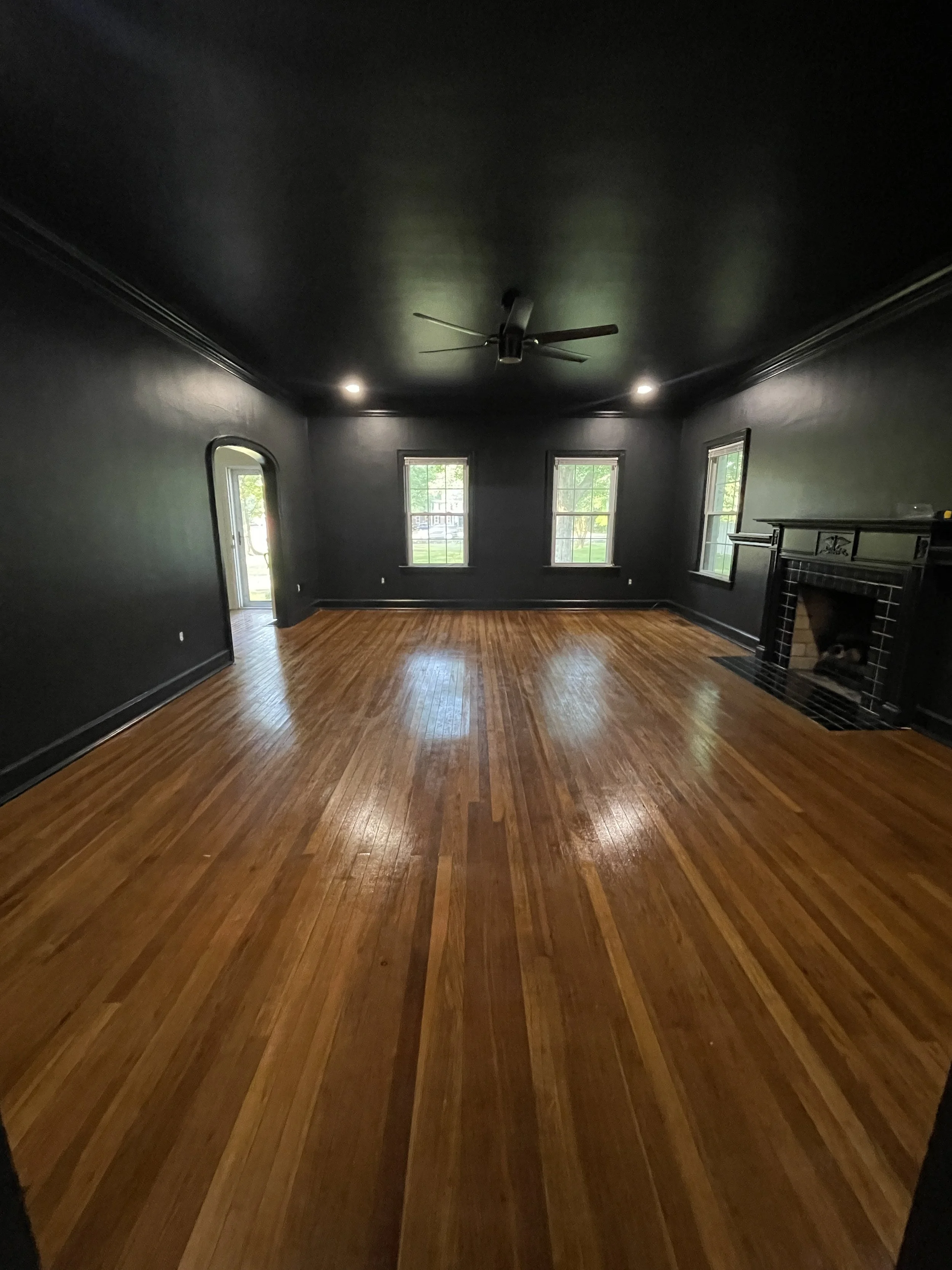 My boyfriend and I just bought a 1940’s stone cottage. The ceilings are 9 feet or so, and the crown moulding is TO DIE FOR. The living room is quite large, and so I thought, why not go BOLD? People thought I was nuts when I told them I was painting the ceiling, walls, and trim all black. Thankfully, my intuition paid off.