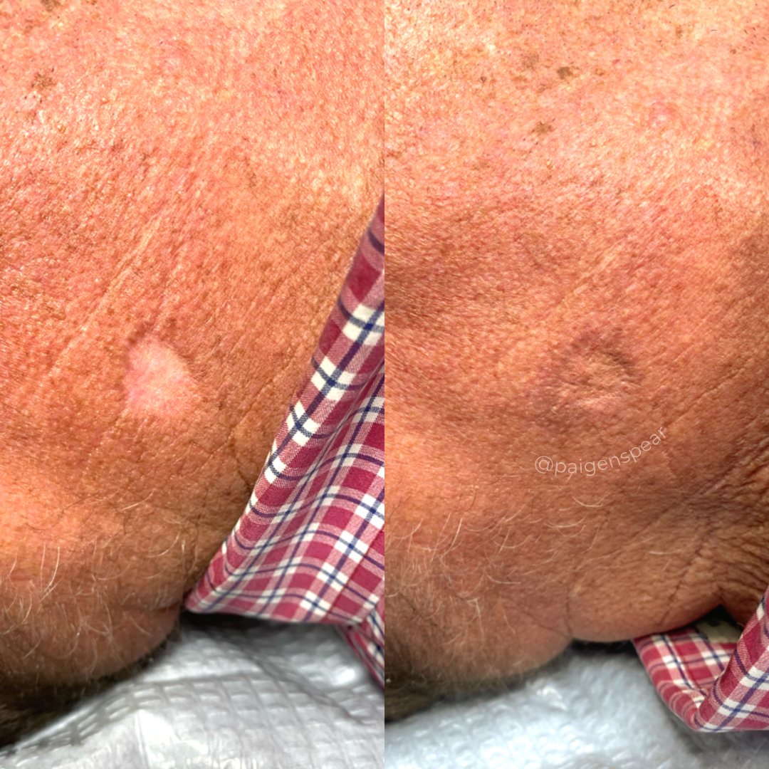 Every scar and stretch mark tells a story, and no 2 are unique. Paige uses a variety of pigments to mix and match to create a custom color that matches your skin tone. The scar and stretch mark and then tattooed with the matching color to blend them in to the surrounding skin.